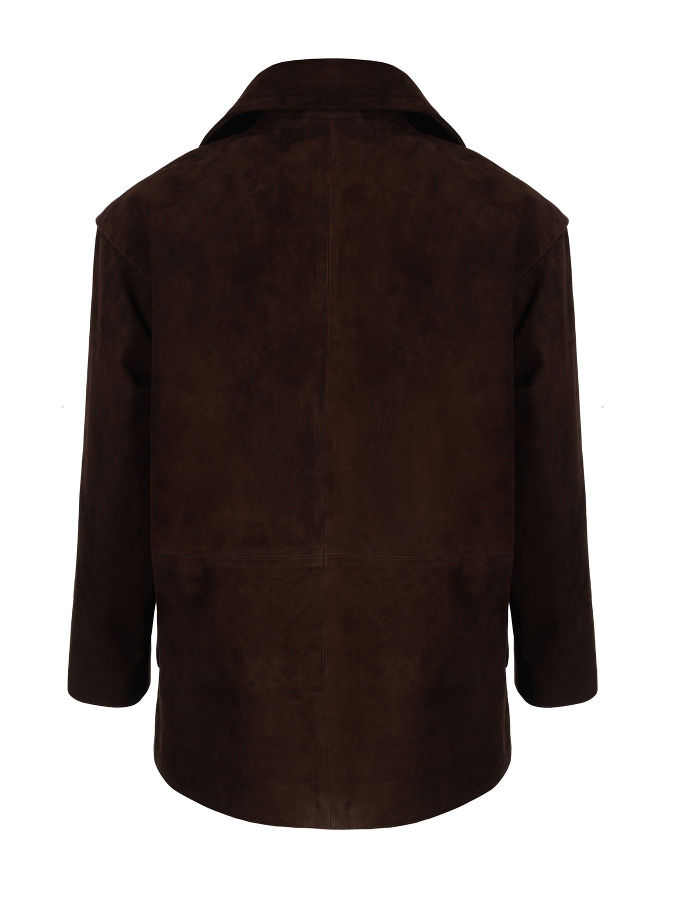 Nietuzinkową formę projektu podkreśla głęboki, czekoladowy kolor, który na zamszowej fakturze prezentuje się wyjątkowo szlachetnie. Uwagę zwracają dopracowane detale: duże, eleganckie guziki oraz oryginalne kieszenie o geometrycznym, skośnym kroju, które przełamują prosta linię żakietu. To produkt klasy premium, uszyty z dbałością o każdy szew w polskiej manufakturze.