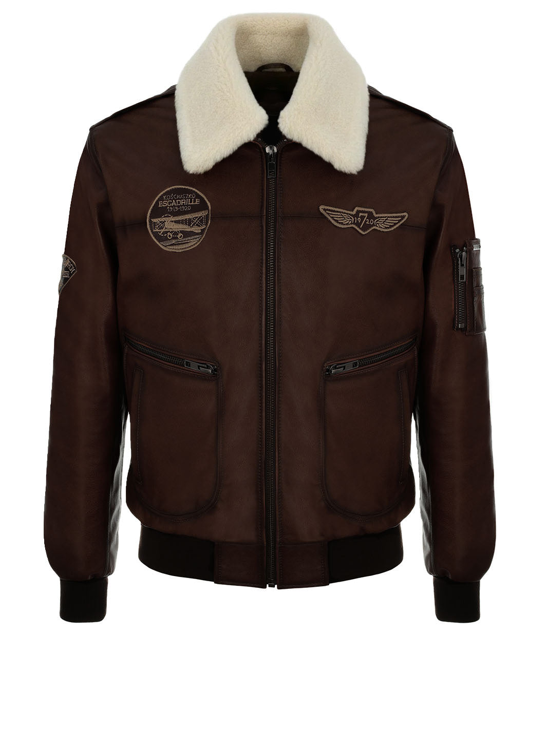 Kurtka pilotka skórzana męska brązowa z kożuchem i naszywkami