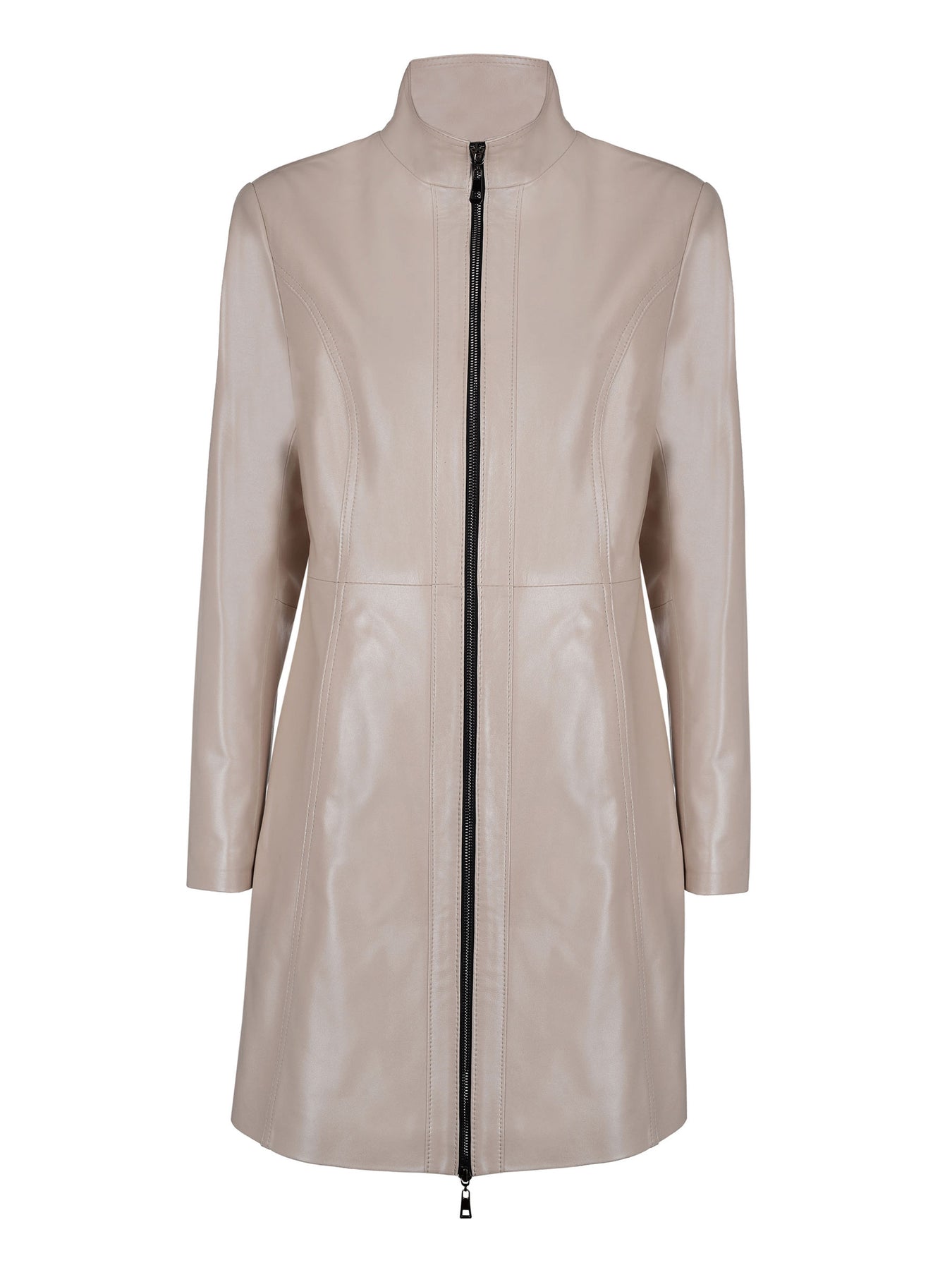 Konstrukcja modelu łączy minimalizm z elegancją. Prosty, lekko taliowany krój z pionowymi przeszyciami optycznie wysmukla sylwetkę, a nowoczesna stójka zastępuje klasyczny kołnierz, dodając całości lekkości. Funkcjonalność zapewnia solidny, czarny zamek dwukierunkowy (suwak góra-dół), który pozwala na wygodną regulację zapięcia i stanowi stylowy, kontrastowy akcent na tle jasnej skóry.